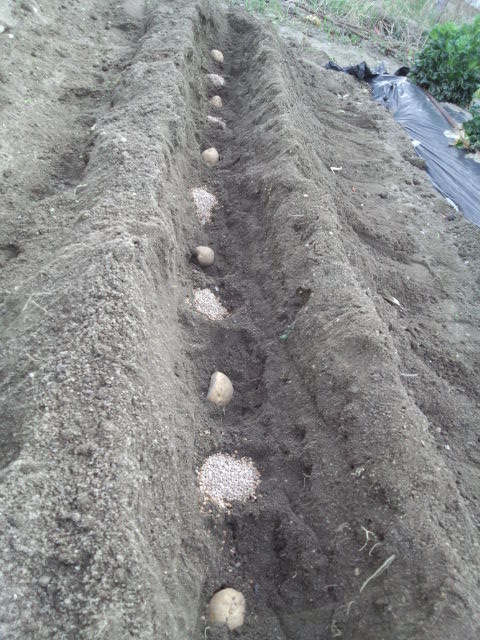 30cm間隔で種芋を植えて、その中間に専用肥料を置く。