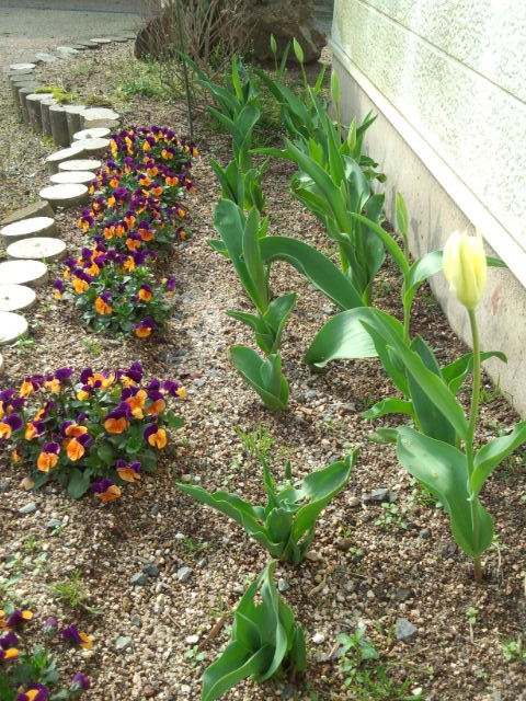 チューリップと、ビオラ。もうすぐ満開かな>