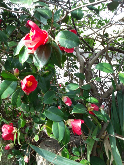 生垣の中の椿の木にも、花が付いています。