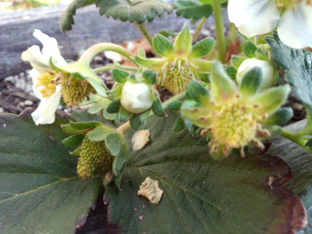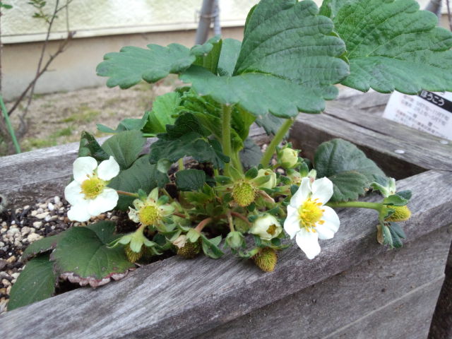 苺に実がついたよ。上手く育つかな?・・まだ、花粉を付ける前に実が付いた。