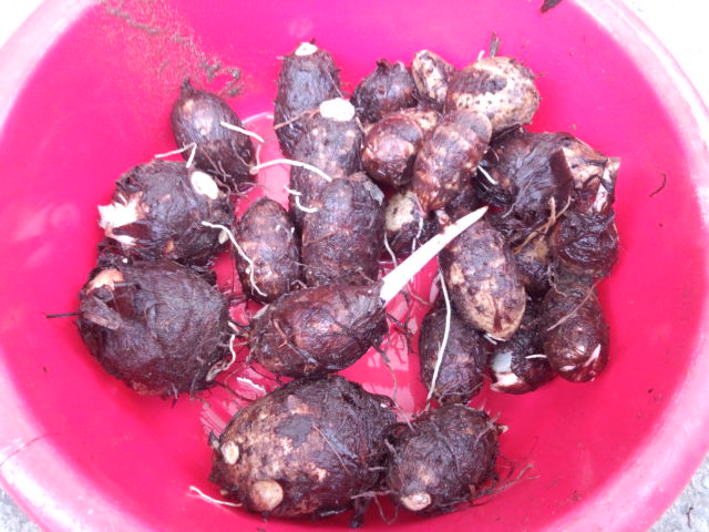 母が、畑で何やら・・立派な里芋(めあか)です。