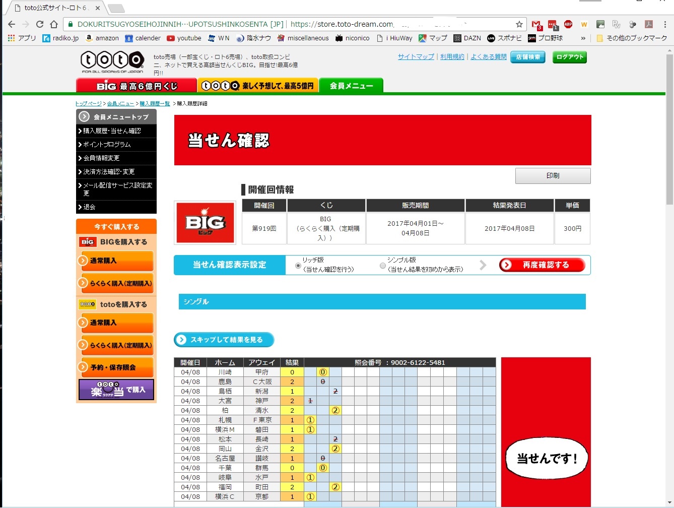第919回BIG、totoくじ結果のお知らせ