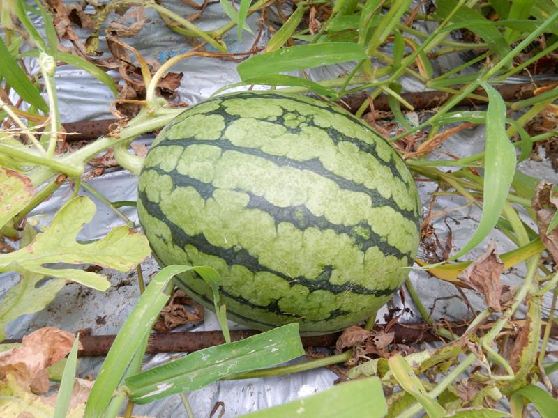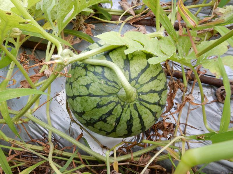 スイカの巻ヒゲが枯れてます。収穫時期ですね。