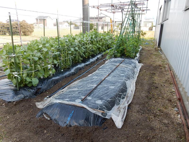 モロッコいんげんの種蒔きと空豆の支柱立て