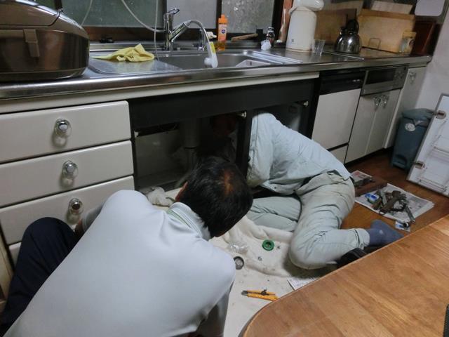 流しの下に潜り込み、配管から破片を回収。