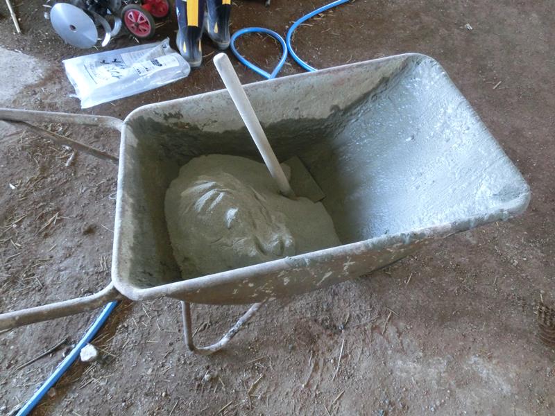 一輪車にモルタル20kgを入れ水4Lでよく混ぜます。