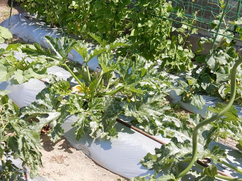 ズッキーニは幹が地面を横に延びるけど、畝から落ちて