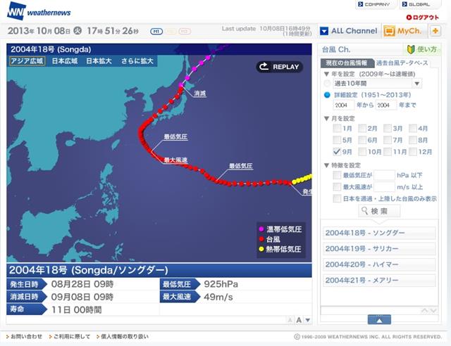 http://ja.wikipedia.org/wiki/%E5%B9%B3%E6%88%9016%E5%B9%B4%E5%8F%B0%E9%A2%A8%E7%AC%AC18%E5%8F%B72004年8月28日にマーシャル諸島付近で発生し、発達しながら西に進み31日には中心付近の最大風速が45m/sと「非常に強い」台風となった。その後も勢力を保ったまま、当初は中国大陸に進むと予想されていたが、太平洋高気圧の衰退により進路を北西に変えて、9月5日に沖縄本島を通過した。名護市では、最低海面気圧924.4hPaを記録した。6日の台風情報では1991年の台風19号に匹敵する勢力で九州北部地方に上陸する進路が極めて濃厚となっており、マスコミもニュース番組で大々的に報道した。その後、勢力は少し衰え「強い」台風となったものの、東シナ海で進路を北から北東に変え、7日9時半頃、長崎県長崎市付近に中心気圧945hPa(ヘクトパスカル)、中心付近の最大風速40m/sの「大型で強い勢力」で上陸。その後台風は、佐賀県、福岡県、山口県へと進み、13時には日本海に出て、速いスピードで移動・北上した。その翌日の8日には東北地方や北海道地方に接近、北海道付近で温帯低気圧になる直前に台風が再発達し、中心気圧が下がり、暴風域が広がる。その後、温帯低気圧となる。また、進路は平成3年台風第19号に酷似しており、北海道に再発達して近づき、大きな被害を出した点は1954年の洞爺丸台風との類似が指摘される。