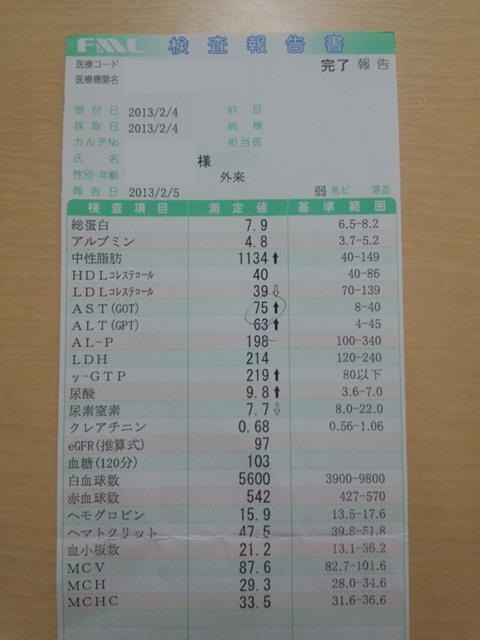先生 「中性脂肪は、1134です。正常値は40-149ですから、ケタ違いです。急性膵炎の恐れが有ります。」