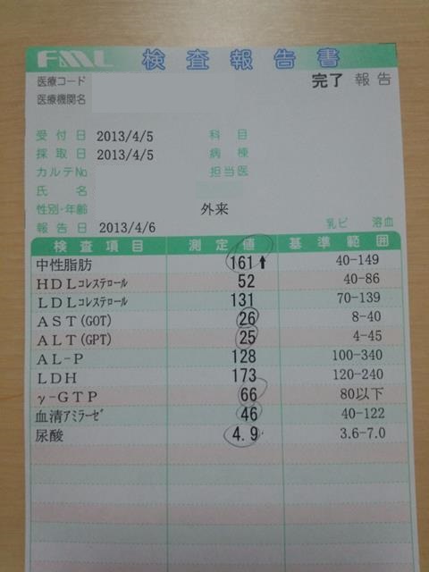 中性脂肪が少し高いように見えるが、他は正常。