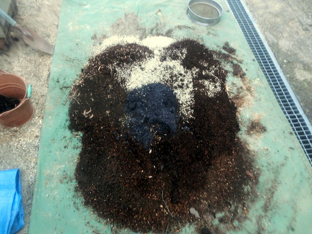 続いて、土に発酵牛ふん堆肥、残っていた市販の土をよく混ぜます。