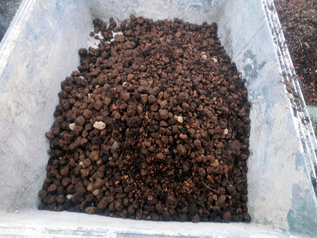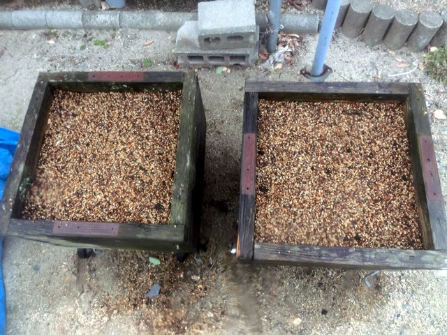 肥料には、自家製の有機肥料を使用。リサイクラーで作った、野菜くずや、高級肉、高級魚(笑)の残骸を乾燥させた肥料。