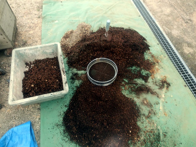 まずは、土をフルイに掛けて、大きい石を選別。