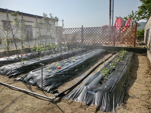 畦の間に黒いホースが見えます。ここに小さな穴が開いていて、シャワーの様に水が勢い良く出てきます。