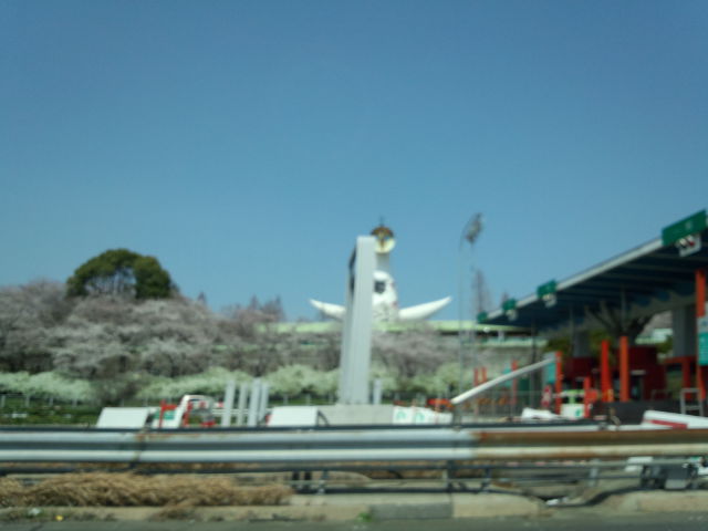 万博記念公園も満開でした。写真は、助手席から撮った公園