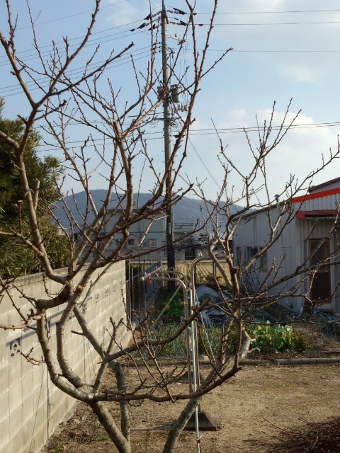 桃の木の剪定。葉っぱが出て、影にならないように重なっている枝を落します。