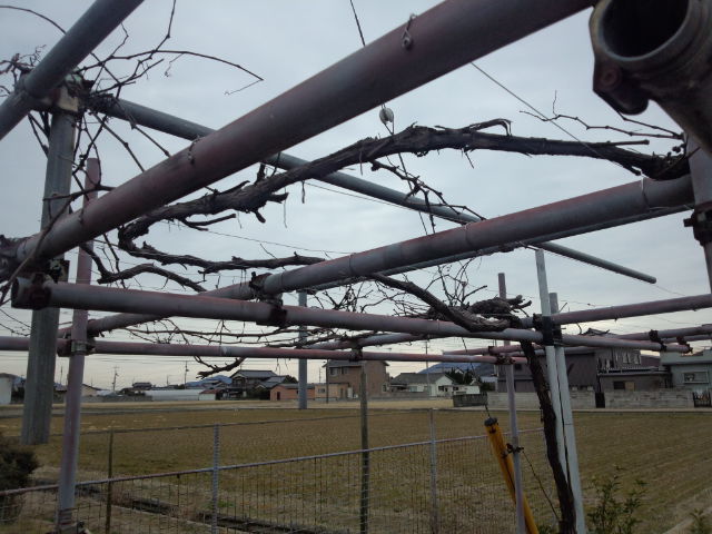 ぶどうの枝を、適当に剪定。棚にはびこりすぎたので、空間を作って、古い枝を落とす。