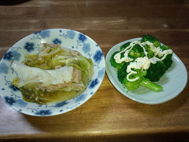 左は、キャベツの間に豚肩ロース+挽肉を入れて、鶏ガラスープで煮たもの。