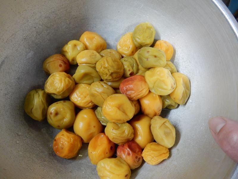 先日漬けた梅を取り出しています。