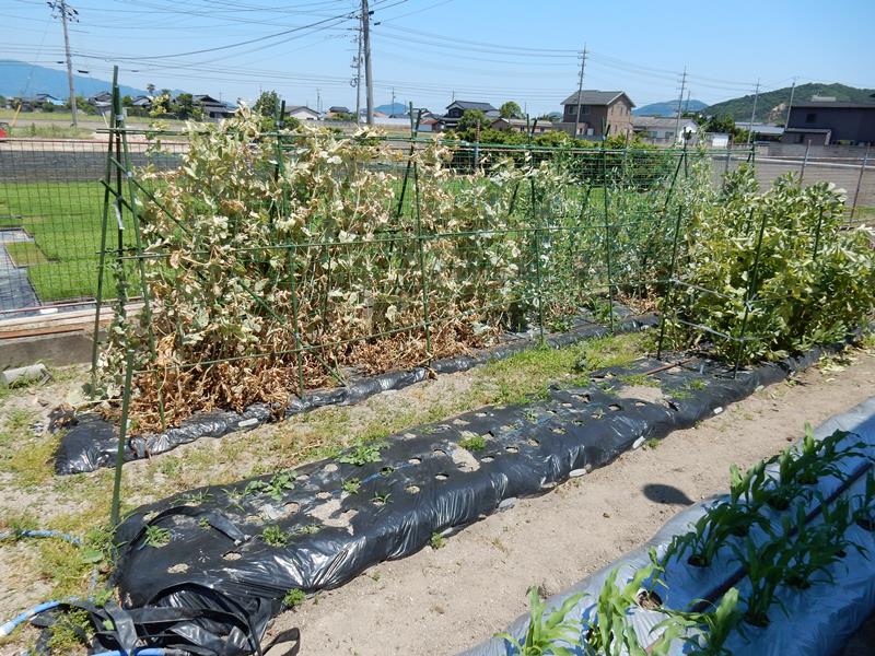 ピースも空豆も、引き上げてサツマイモを植えます。