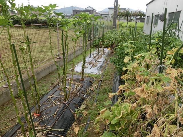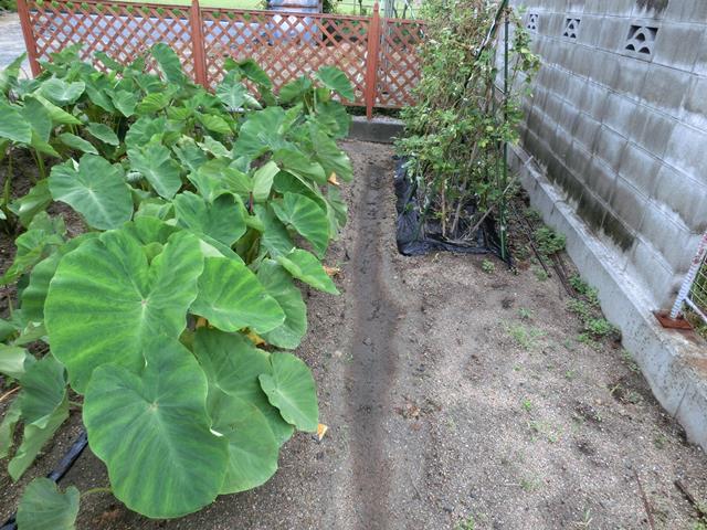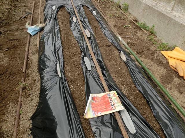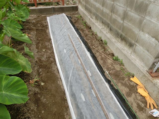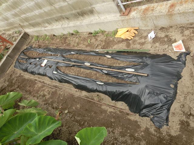 奥の銀色マルチの部分(トウモロコシの後)にネギを植えます。